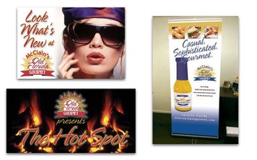 and displays such as table-top signs, table skirts, pop up displays and full back-wall displays.